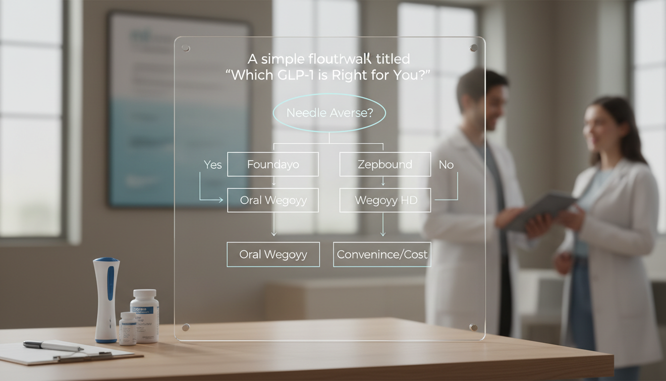 First, clarify your priorities. Is your number one goal to achieve the maximum possible weight loss? If so, the high-efficacy injectables like Zepbound (22.5%) and Wegovy HD (20.7%) are likely where your conversation should start. Or, is your priority convenience and avoiding needles at all costs? In that case, the oral options are your focus. Foundayo offers ultimate simplicity, while Oral Wegovy provides a bit more weight loss power in exchange for a strict morning routine.